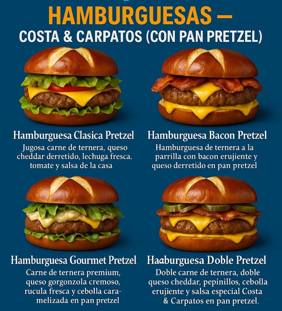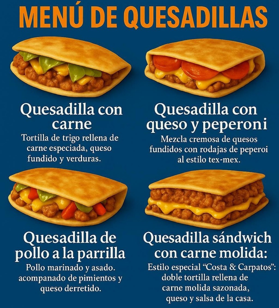 Somos Costa & Carpatos, un food truck especializado en street food mediterráneo con inspiración hispano-rumana: hamburguesas gourmet, pizzas artesanales, quesadillas y especialidades a la parrilla.