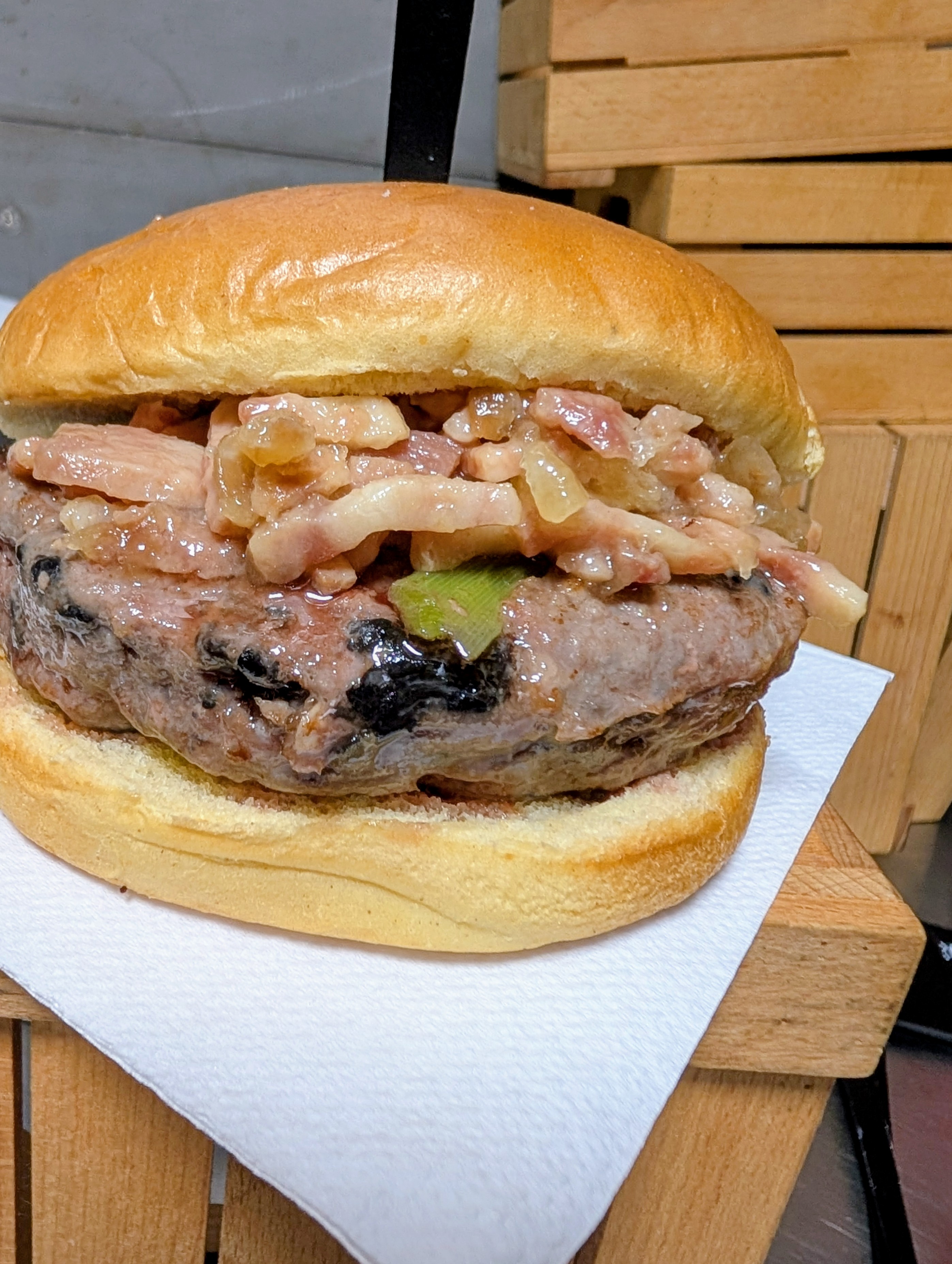 LA RURAL -Hamburguesa de ternera con trompetes de la mort (setas) , ajos tiernos y una melmelada de bacon con cebolla caramelizada