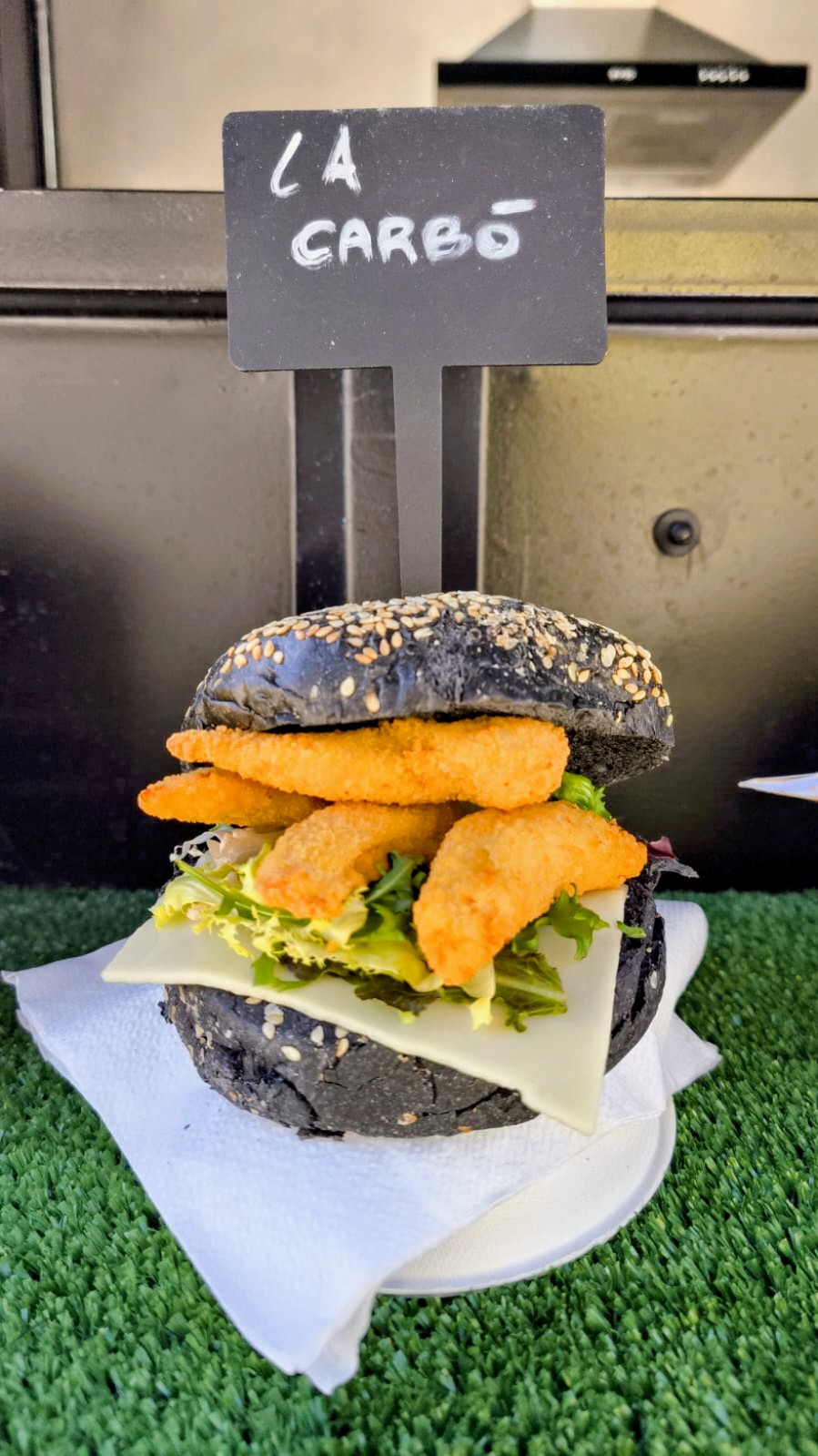 LA CARBÓ-pan negro de carbon con pollo rebozado queso fundido y lechuga del huerto