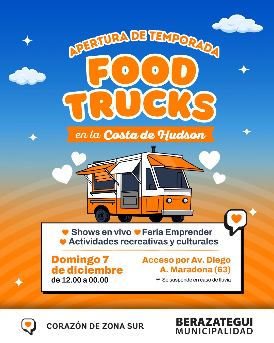 La Municipalidad de Berazategui anunció el regreso del espacio de food trucks en la Costa de Hudson, que retomará su actividad a partir del 7 de diciembre. La propuesta funcionará todos los sábados y domingos de diciembre, enero y febrero, de 12.00 a 00.00, además del lunes 8 de diciembre por ser feriado.