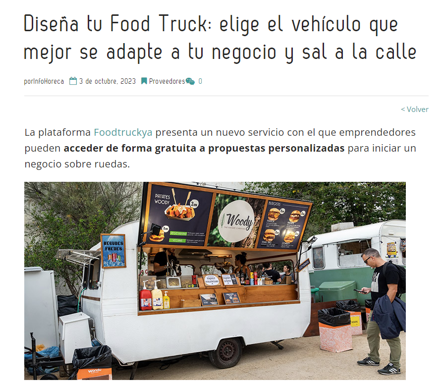 El portal InfoHoreca, especializado en el canal Horeca de hoteles, restaurantes y catering, incluye una noticia sobre el servicio Diseña tu food truck de Foodtruckya, para que todo aquel que quiera tener un food truck personalizado en España pueda obtener presupuestos y propuestas directamente de los fabricantes de food trucks.