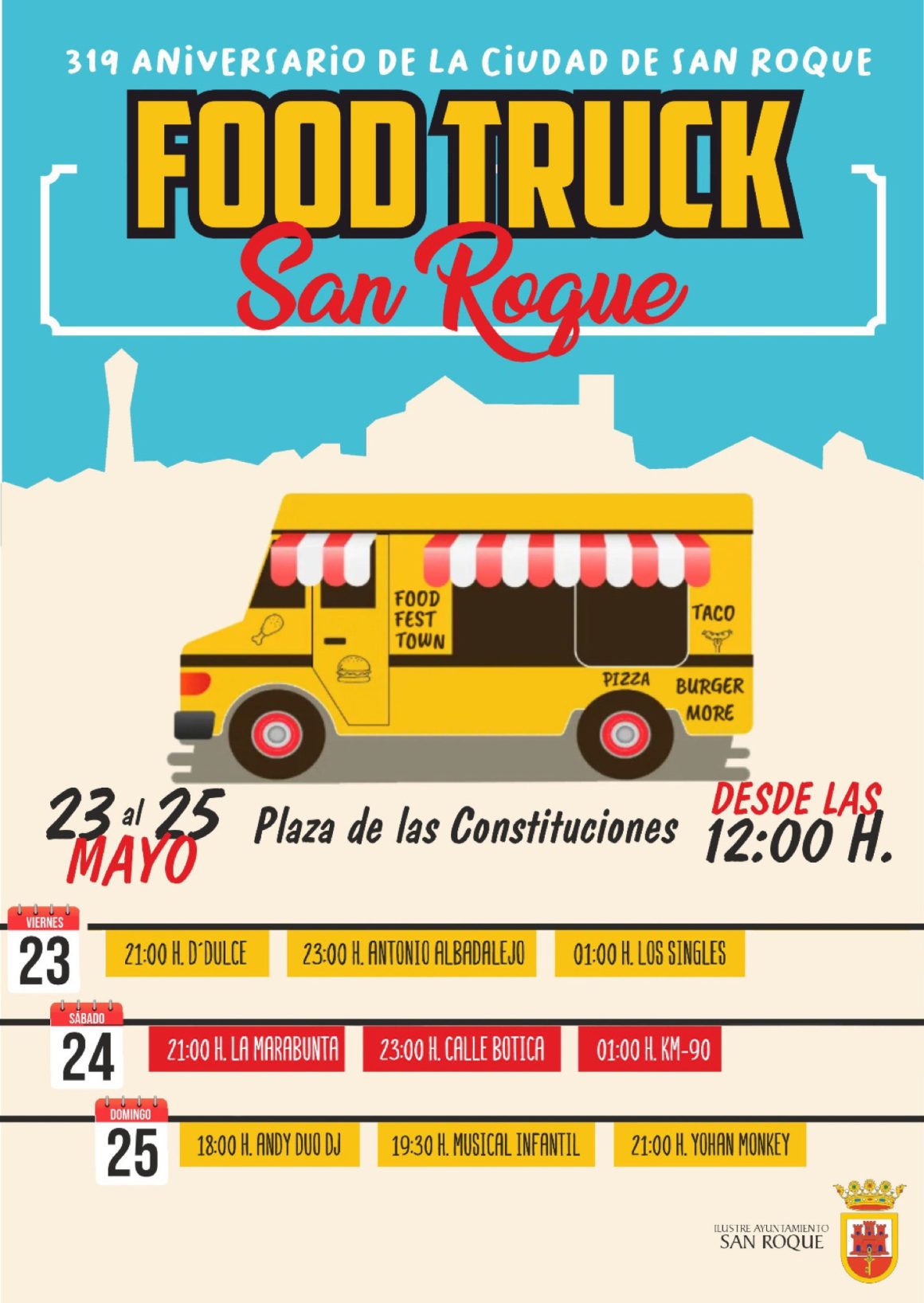 La Delegación de Comercio ha organizado la presencia de food trucks en la Plaza de Las Constituciones para celebrar el 319 aniversario de la fundación de San Roque, Cádiz, del 23 al 25 de mayo. Durante estos días, los asistentes podrán disfrutar de una amplia oferta gastronómica internacional de 12:00 a 00:00 horas.