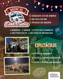 La ciudad de Venado Tuerto desarrollará este sábado 24 de enero una nueva jornada del Encuentro de Sabores y Cultura, una propuesta con food trucks que combina gastronomía y espectáculos en el espacio público. La actividad se realizará en el Prado de María, ubicado en la intersección de Hipólito Yrigoyen y Lisandro de la Torre, desde las 19:00 hasta la medianoche, como parte de la agenda municipal Verano en Venado.