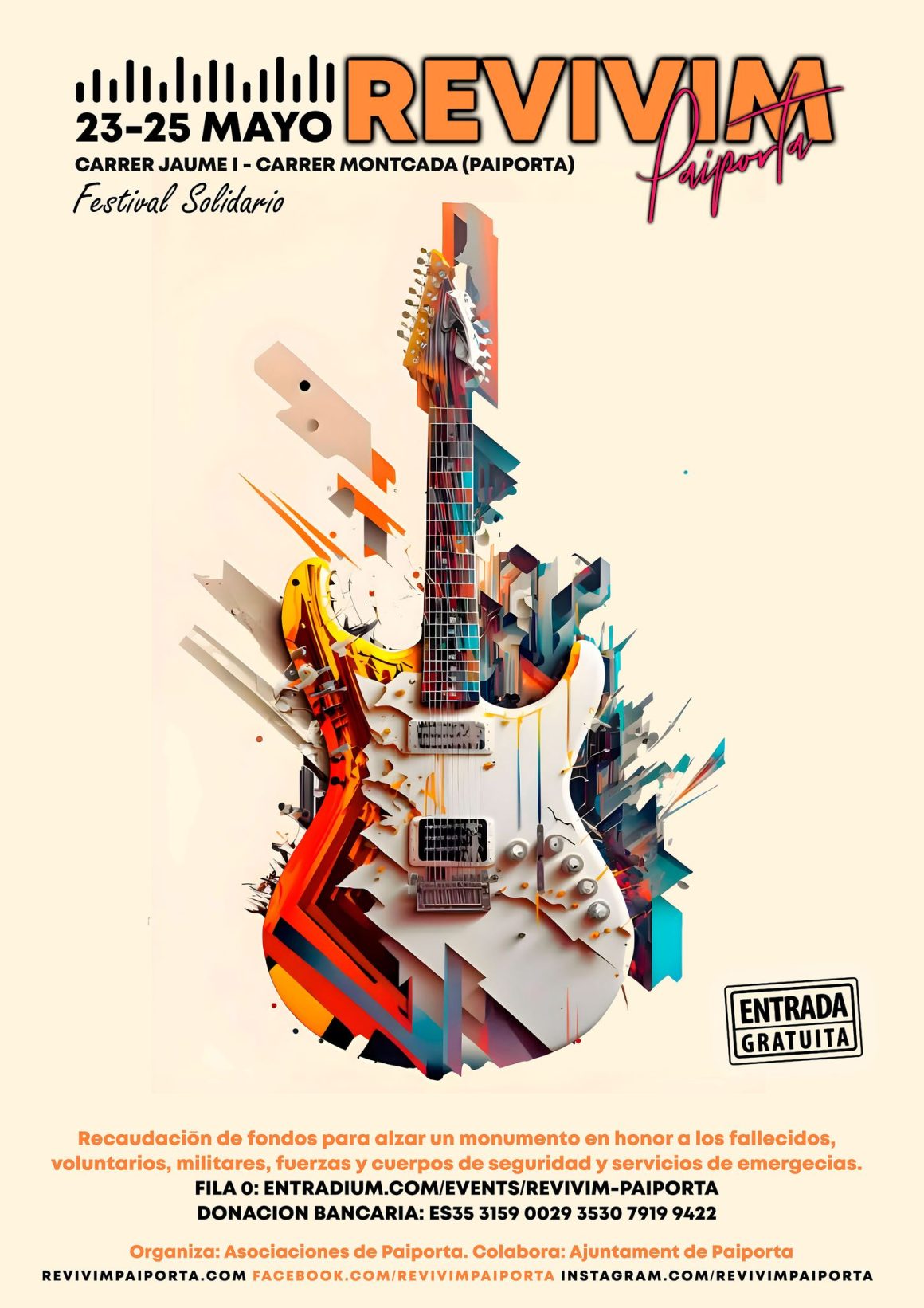 Del 23 al 25 de mayo se celebrará en Paiporta el festival «Revivim Paiporta«, un evento solidario organizado por asociaciones culturales locales con el objetivo de honrar a las víctimas de la DANA y rendir homenaje a los voluntarios, cuerpos de seguridad, fuerzas armadas y servicios de emergencia que participaron en las labores de ayuda.